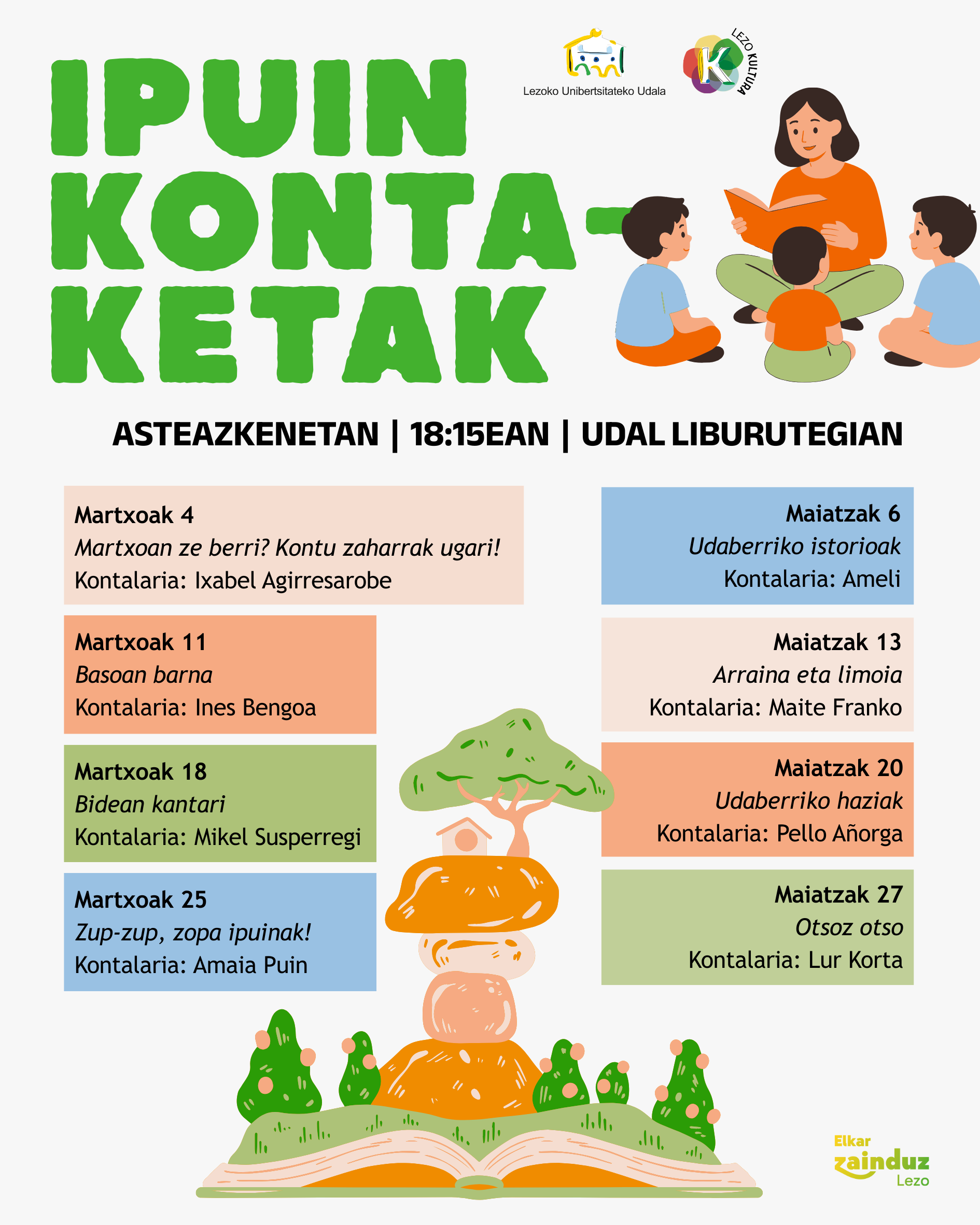 La Biblioteca Municipal de Lezo ha organizado ocho sesiones de cuentacuentos para la primavera. Las sesiones están dirigidas a niños y niñas de entre 4 y 7 años. Serán los miércoles, todos a las 18:15 y en la Biblioteca Municipal de Lezo.
