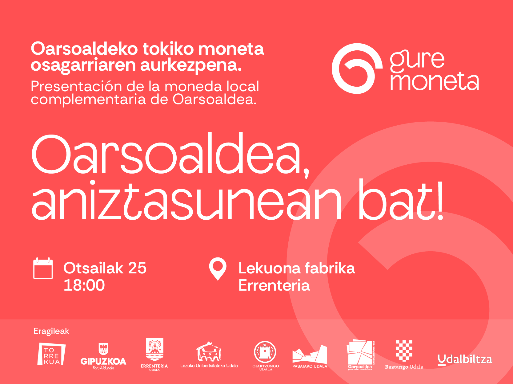 El miércoles, 25 de febrero, tendrá lugar la presentación de la moneda local complementaria de Oarsoaldea, ‘Oarsoaldea, aniztasunean bat’ (Oarsoaldea, una en la diversidad). La cita será a las 18:00 horas en la Lekuona Fabrika. La entrada es libre, toda persona interesada está invitada a acudir.