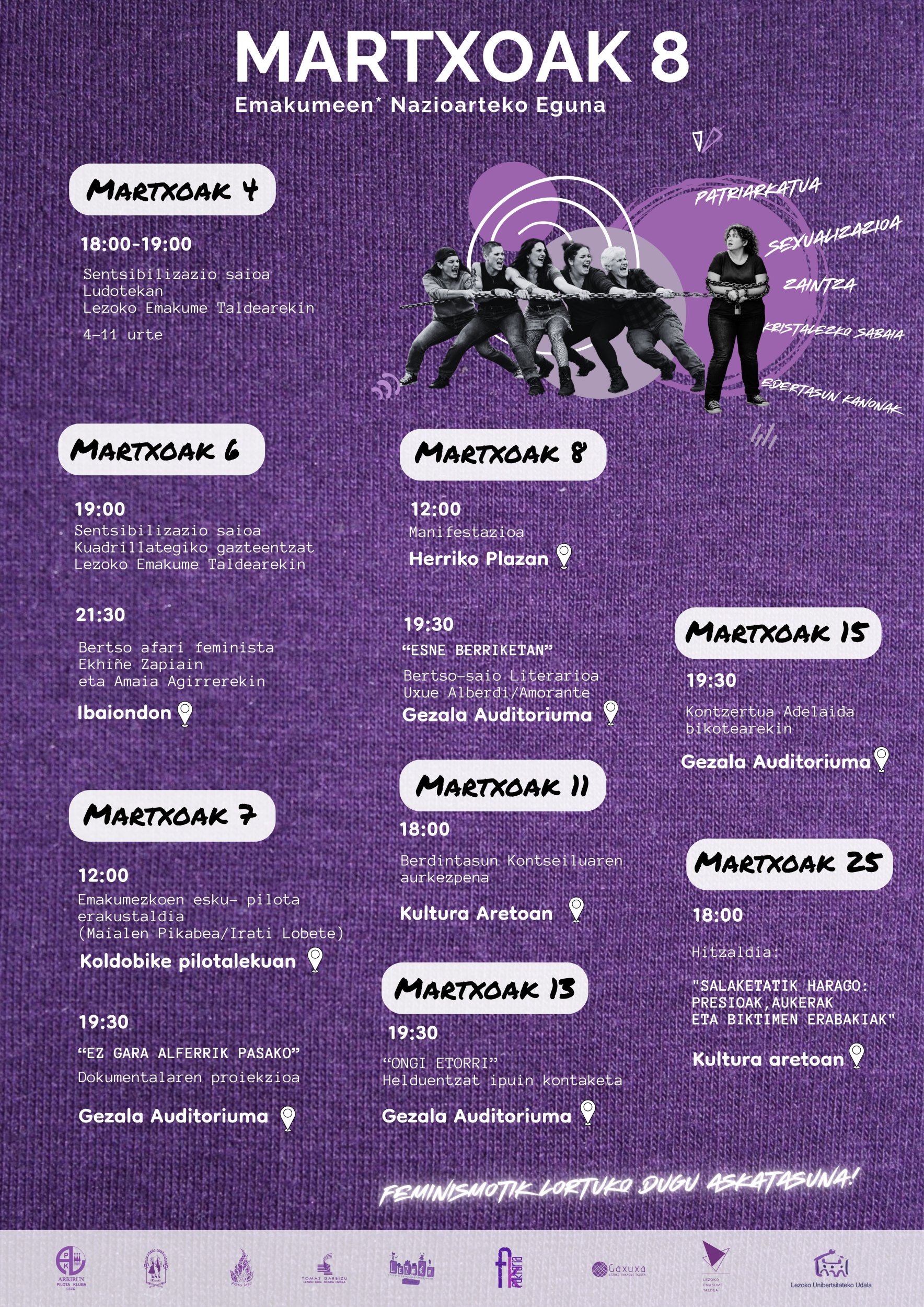 Horrez gain, izaera desberdineko hitzorduak antolatu dituzte: bertso-afari feminista, emakumezkoen pilota erakustaldia, kultur-ekitaldiak, eta askoz gehiago. Hitzaldiak eta sentsibilizazio jarduerak ere antolatu dituzte, feminismoaren gaur egungo erronkak, zaintza-lanen aitortza eta indarkeria matxistaren prebentzioa ardatz hartuta, bai eta emakumeen errealitatea eta berdintasunaren oinarriak gaztetxoenei iristarazteko.