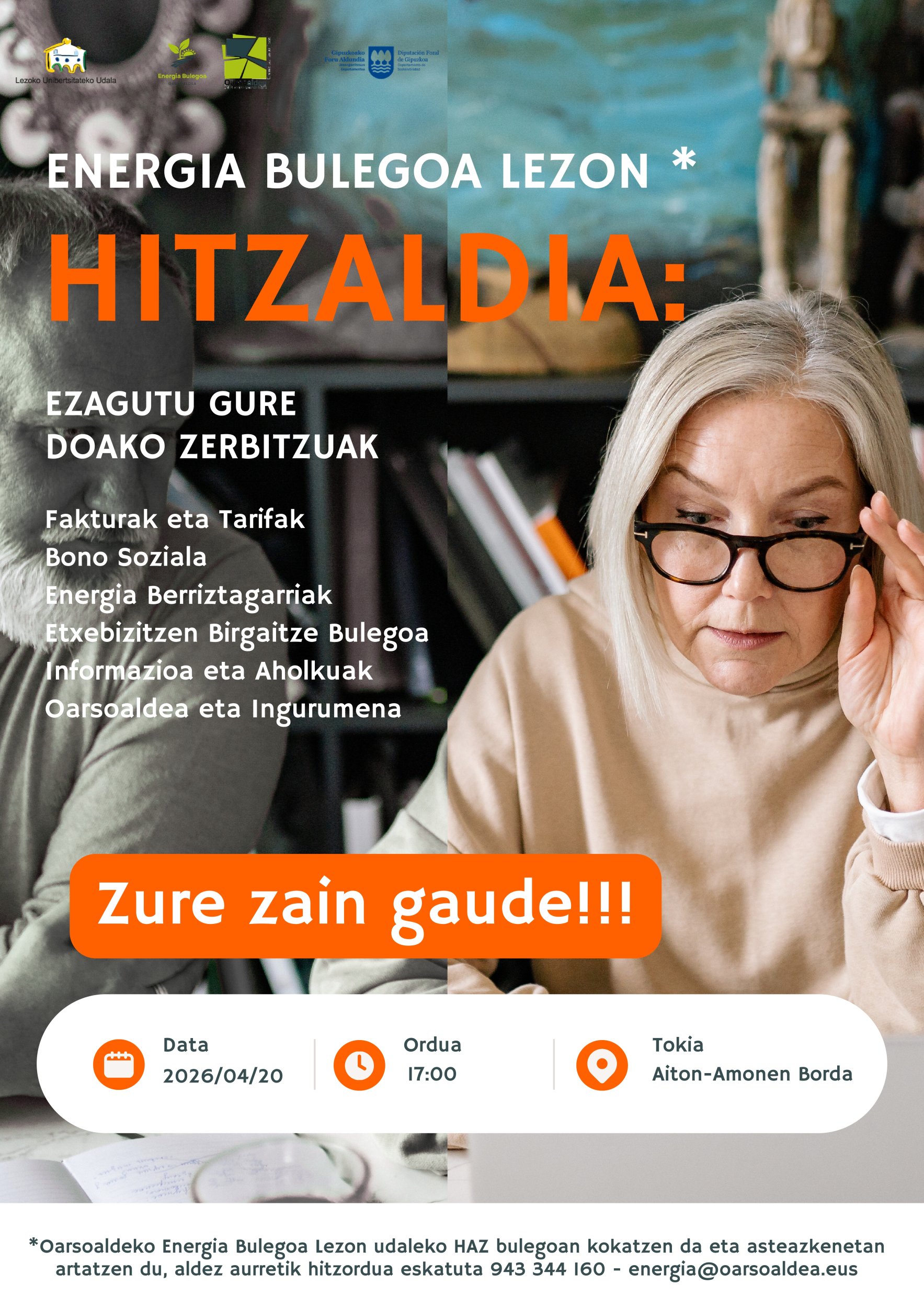Zerbitzua Udaleko HAZ bulegoan ematen da asteazkenero 2025eko maiatzetik, aurretiko hitzorduarekin, eta fakturei, tarifei, bonu soziala bezalako laguntzei, energia berriztagarriei, etxebizitzen birgaitzeari eta abarri buruzko aholkularitza pertsonalizatua eskaintzen du. Hitzaldia apirilaren 20an, 17:00etan, izango da Aiton-Amonen Bordan baliabide hauen berri emateko.