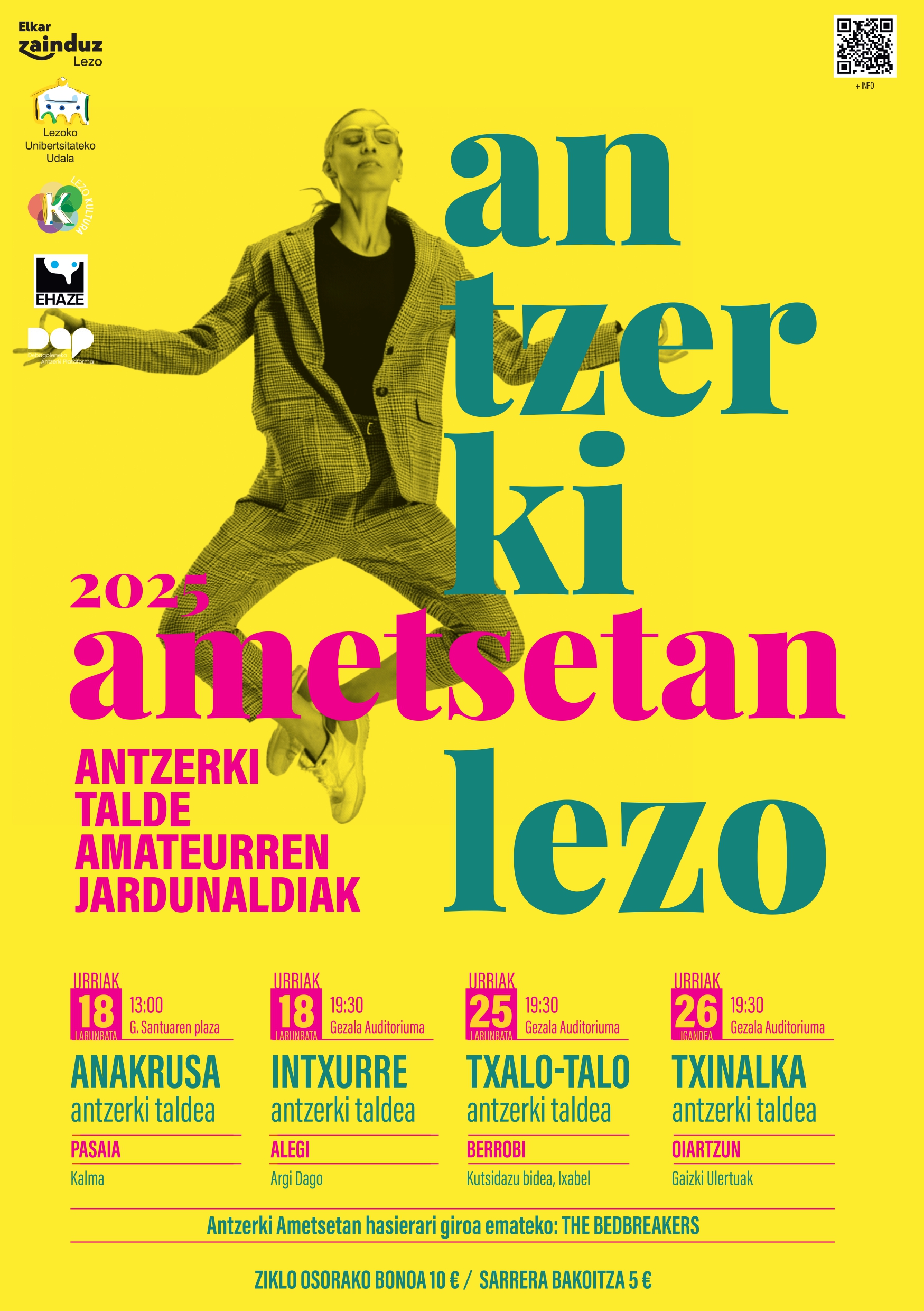 Aurten ere maila handiko taldeak egongo dira Lezon urriaren 18, 25 eta 26an. Pasaiako ANAKRUSA, Alegiko INTXURRE, Berrobiko TXALO-TALO eta Oiartzungo TXINALKA antzerki taldeen lanak ikusteko aukera izango dute bertaratutakoek.